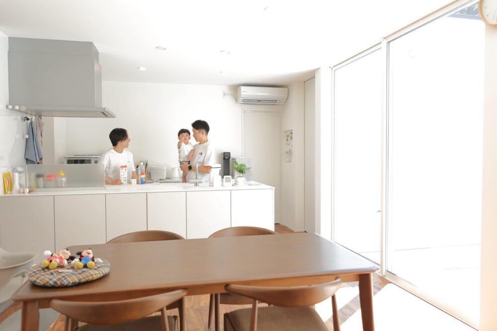 キッチンからはLDK全体を見渡せるので、家事をしながらも家族の様子を感じられるのが安心です。