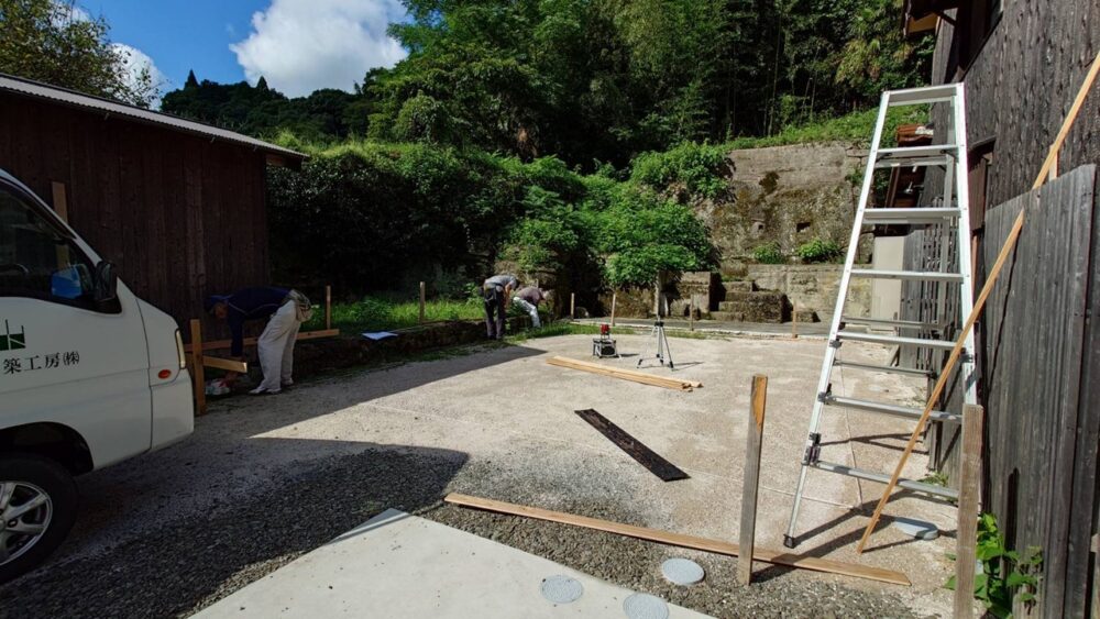 現場では新築N様邸にて「遣り方工事」を
